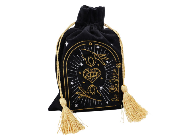 Tarot cards bag: Made of black velvet with gold embroidery and tassels for protection and versatility.
